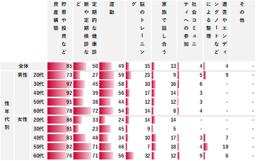 老後の生活に備えて取り組んでいる内容は、「貯蓄や投資など資産構築」が85%で突出して高い。性年代別に見ると、「定期的な健康診断や定期検診など」は男女ともに年代が高い層、「脳のトレーニング」は女性60代が高くなっていた。