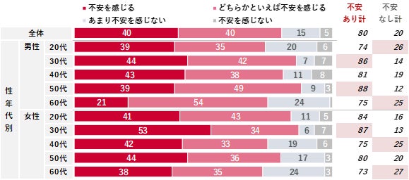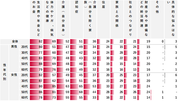 不安を感じる内容は、「生活費や年金などのお金」が82%と最も高く、次いで「体力やケガ、病気などの健康(69%)」、「介護(自分自身)(52%)」が続く。性年代別に見ても「生活費や年金などのお金」はどの性年代も80%前後と高かった。一方で、「体力やケガ、病気などの健康」は男女ともに40代以上で高くなっており、加齢によって不安が顕在化する様子が見られた。