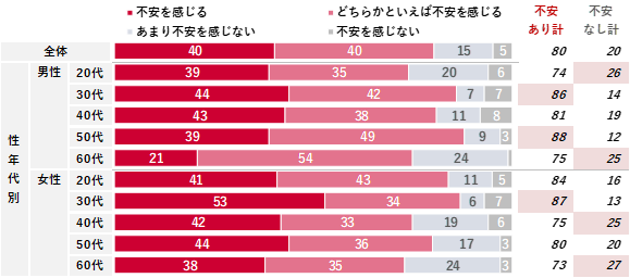 老後の生活に不安を感じているかについて、「不安を感じる」「どちらかといえば不安を感じる」を合わせると、全体で80%という結果となった。女性30代では「不安を感じる」という回答のみで53%と特に高かった。