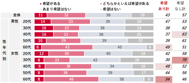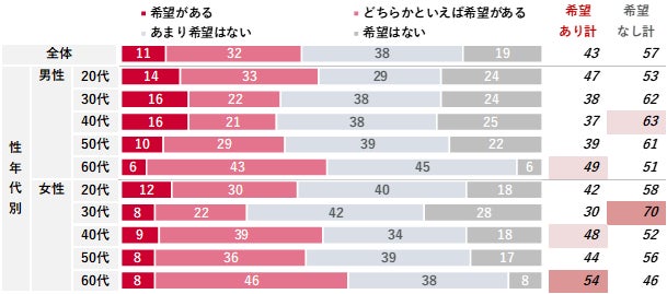 性年代別では、女性30代で「希望なし」が70%と、最も高くなっていた。また60代を見ると、男女ともに「希望あり」が50%前後と高かった。