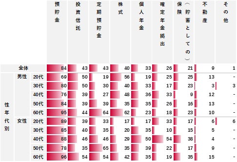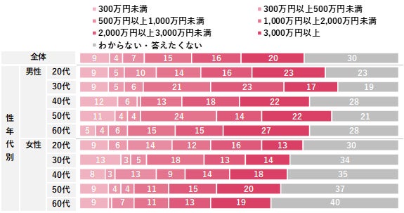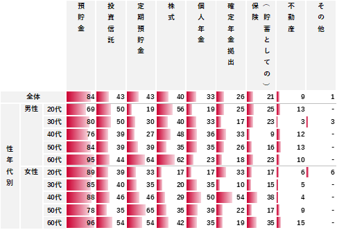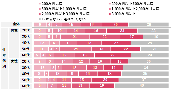 「貯蓄や投資など資産構築」について、具体的に取り組んでいる手段と目標額を聴取した。具体的な手段では、「預貯金」が84%で最も高く、次いで「投資信託」「定期預貯金」がともに43%だった。また、目標額は「3,000万円以上」が20%で最も高く、次いで「2,000万円以上3,000万円未満(16%)」「1,000万円以上2,000万円未満(15%)」が続いており、合わせると「1,000万円以上」で50%以上となった。