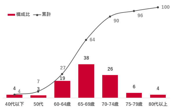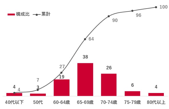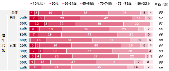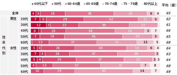 老後は何歳からだと思うか聴取したところ、平均値は65歳となった。5歳刻みで回答結果を確認すると、「65~69歳」が38%と最も高く、次いで「70~74歳(26%)」「60~64歳(19%)」が続く。累計すると「74歳以下」で全体の90%を占めた。