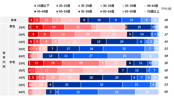 また、備え意向がある方に取り組み開始時期を聴取したところ、平均値は48歳だった。男女ともに年代が高くなるほど、取り組み開始の年齢が高かった。