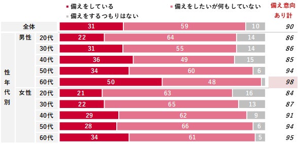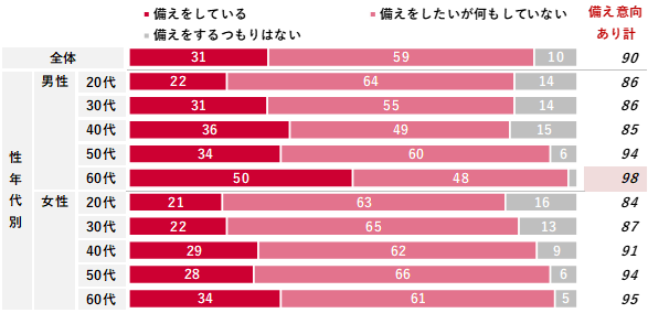 老後の生活に備えた取り組みについて、実施している、もしくは実施の意向があると回答した人は90%だった。内訳は、実際に「備えをしている」が31%、「備えをしたいが何もしていない」が59%となった。性年代別に見ると、高年代において「備えをしている」が高い傾向が見られた。特に男性60代が50%と高い。