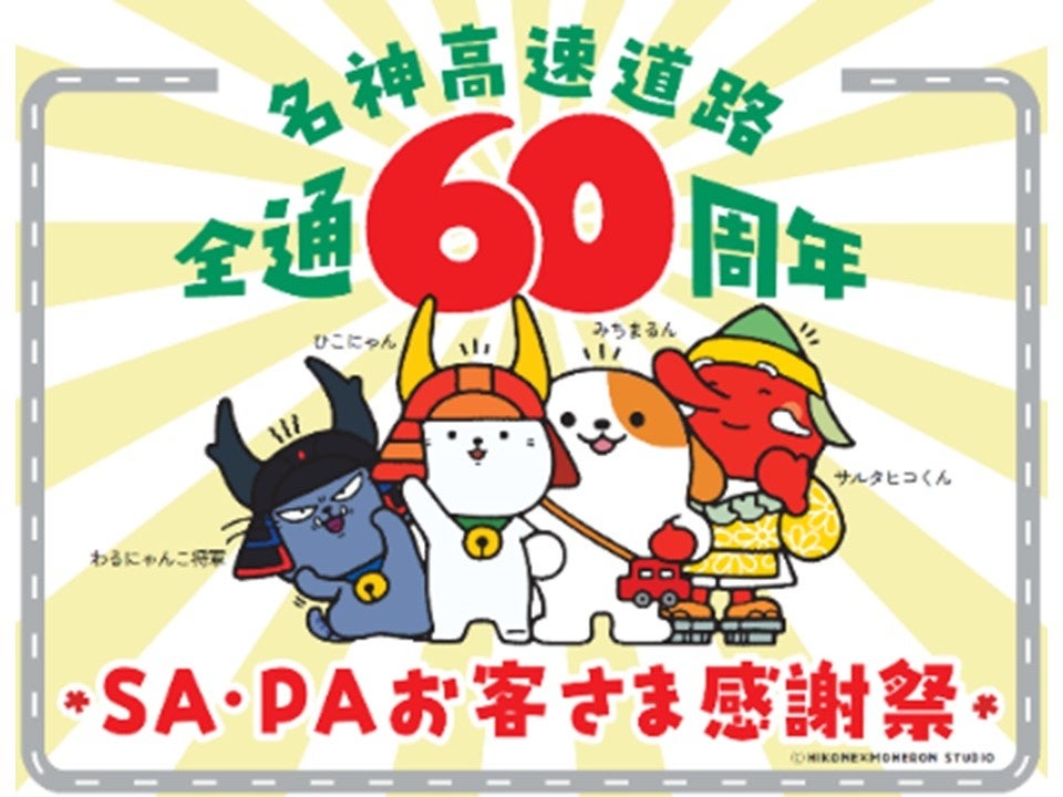 西日本高速道路サービス・ホールディングス株式会社 関西支社(大阪府吹田市、支社長・佐田(さた) 惠(めぐみ))と中日本エクシス株式会社 滋賀支店(滋賀県犬上郡多賀町、支店長・鈴木(すずき) 智之(ともゆき))と中日本エクシス株式会社 一宮支店(愛知県一宮市、支店長・吉井(よしい) 基博(もとひろ))は、E1 名神高速道路(名神)全線開通60周年を記念し、これまでのご愛顧に感謝を込めて、名神のサービスエリア(SA)・パーキングエリア(PA)にてお客さま感謝祭を開催します。 名神をご利用の際は、ぜひSA・PAにお立ち寄りください。