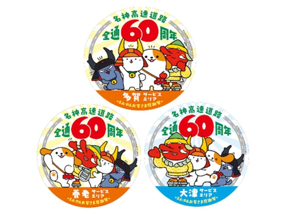 各SA・PAの名神60周年全通記念特別メニュー、記念福袋をご購入いただいた方に、「ひこにゃん」、「わるにゃんこ将軍」、「サルタヒコくん」、「みちまるくん」がコラボしたオリジナルステッカーをもれなく1枚プレゼントします。オリジナルステッカーは3柄(全5種類)となります。ぜひ全て手に入れてみて下さい!