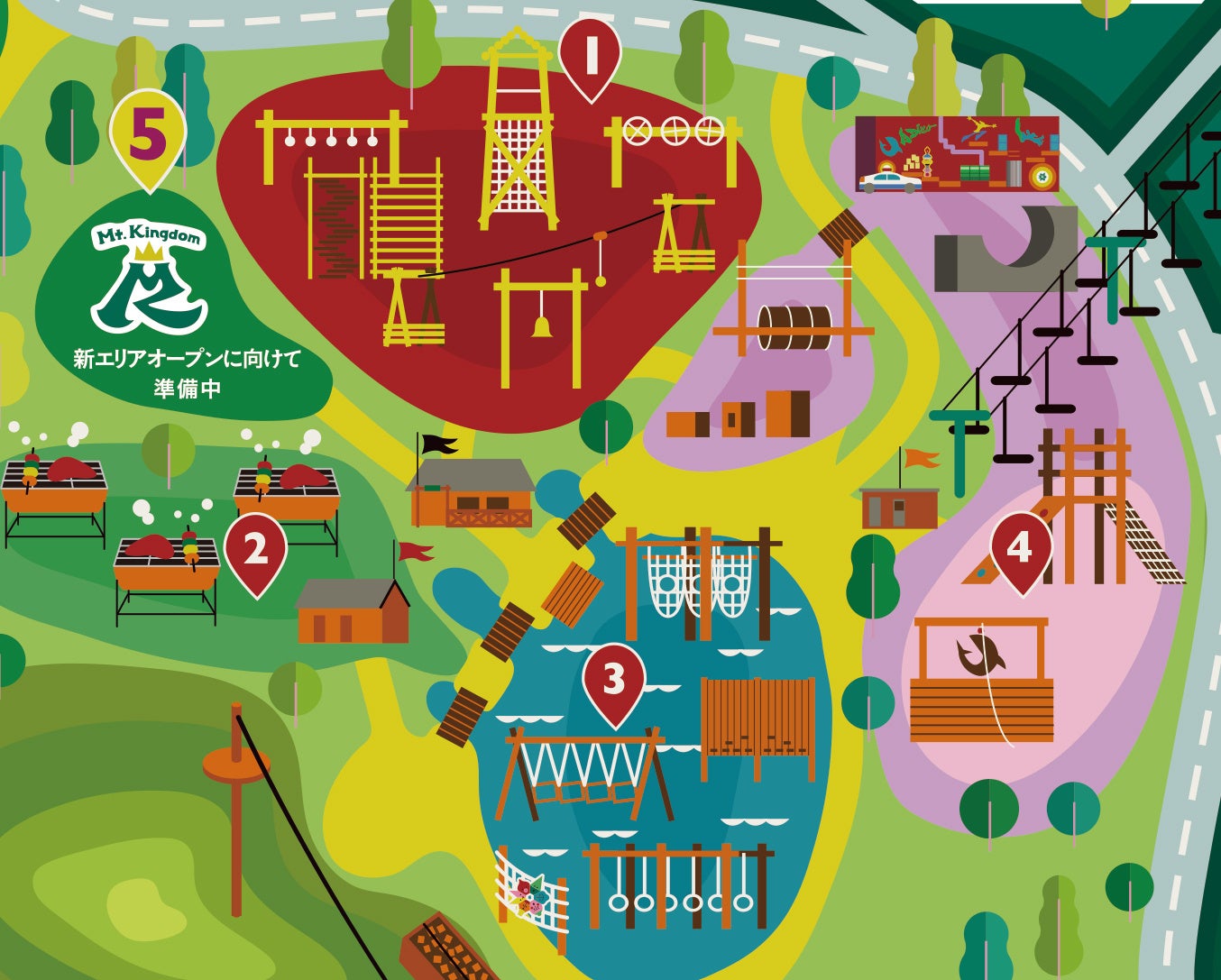 広大な丘陵地に新設する「Mt.Kingdom」は、お城をテーマとした複合型アスレチックやドラゴンの体内を駆け巡るネットアスレチックを中心に、1つ1つのアスレチックがRPGに登場する試練のように感じられる計31ポイントの新感覚アスレチックです。