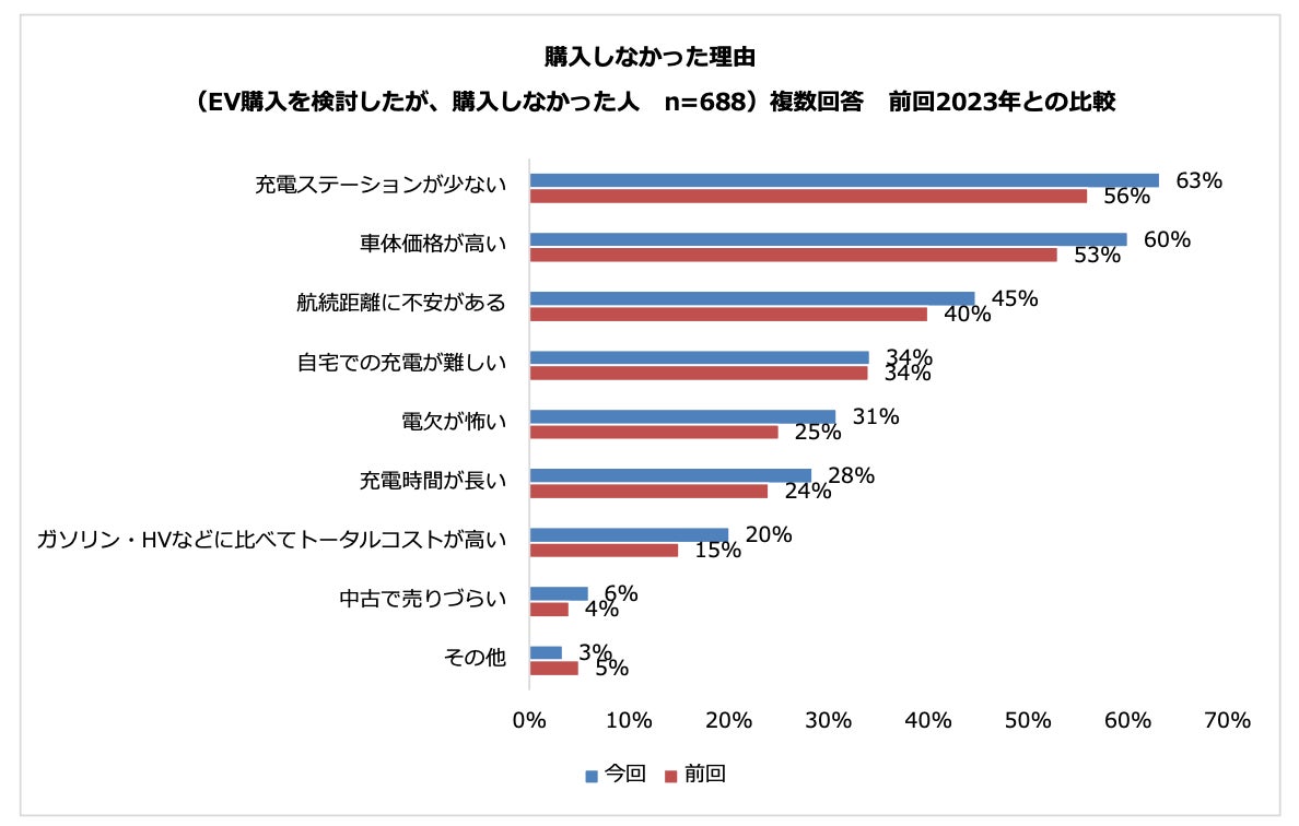 EVの購入を検討したものの、購入しなかった理由は、1位「充電ステーションが少ない」63%、2位「車体価格が高い」60%、3位「航続距離に不安がある」45%となり、前回(2023年)から順位に変動はありませんでした。