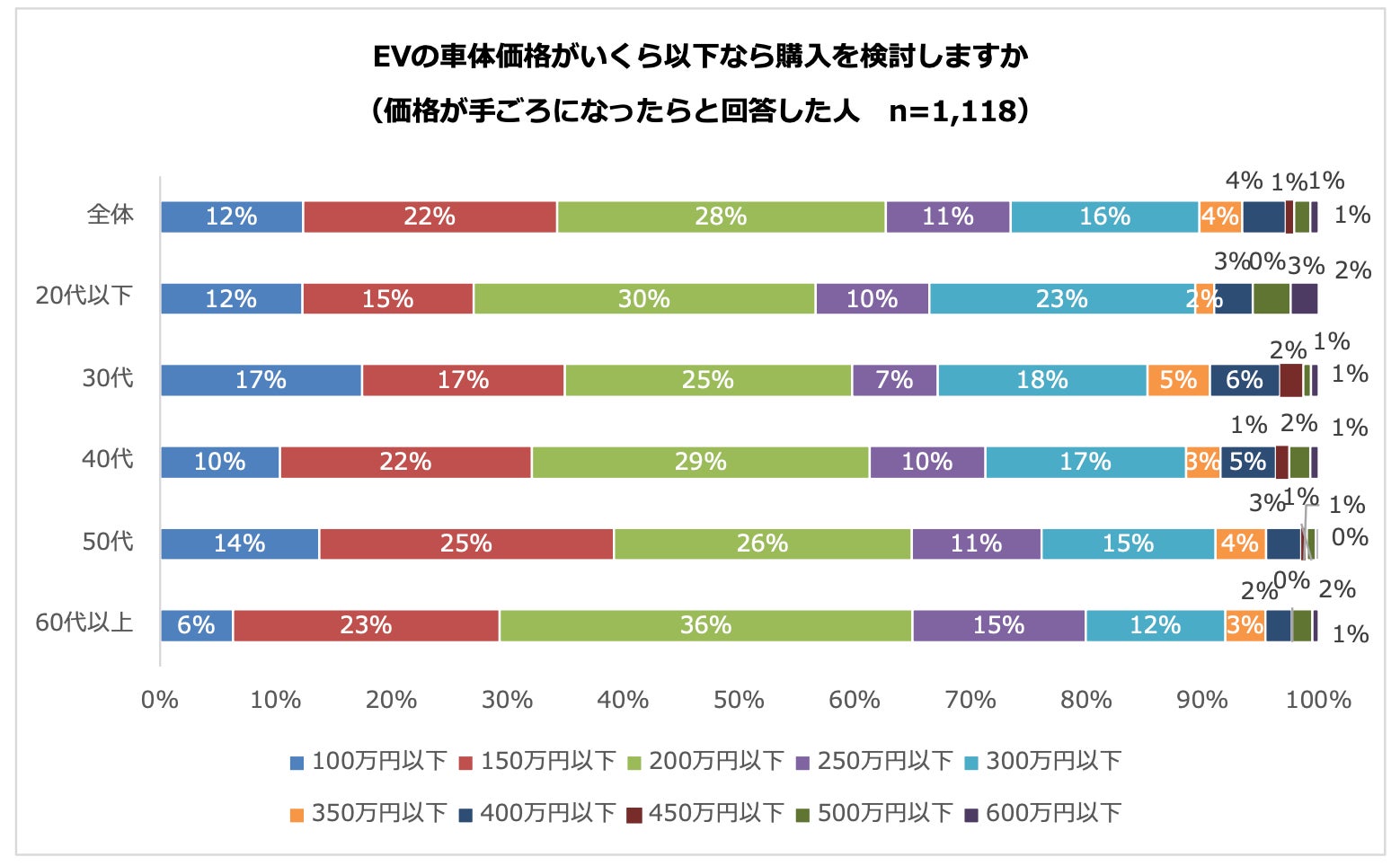 価格が手ごろになったらEVを購入すると答えた人のうち、およそ3人に1人は、車体価格が「200万円以下」になったら購入を検討すると回答しました。ガソリン車の場合、車体価格の最安値が90万円程度な一方、EVの最安値は軽自動車でも補助金を含めて約200万円となっており、EV購入に至るにはさらなる手ごろ感が必要なようです。