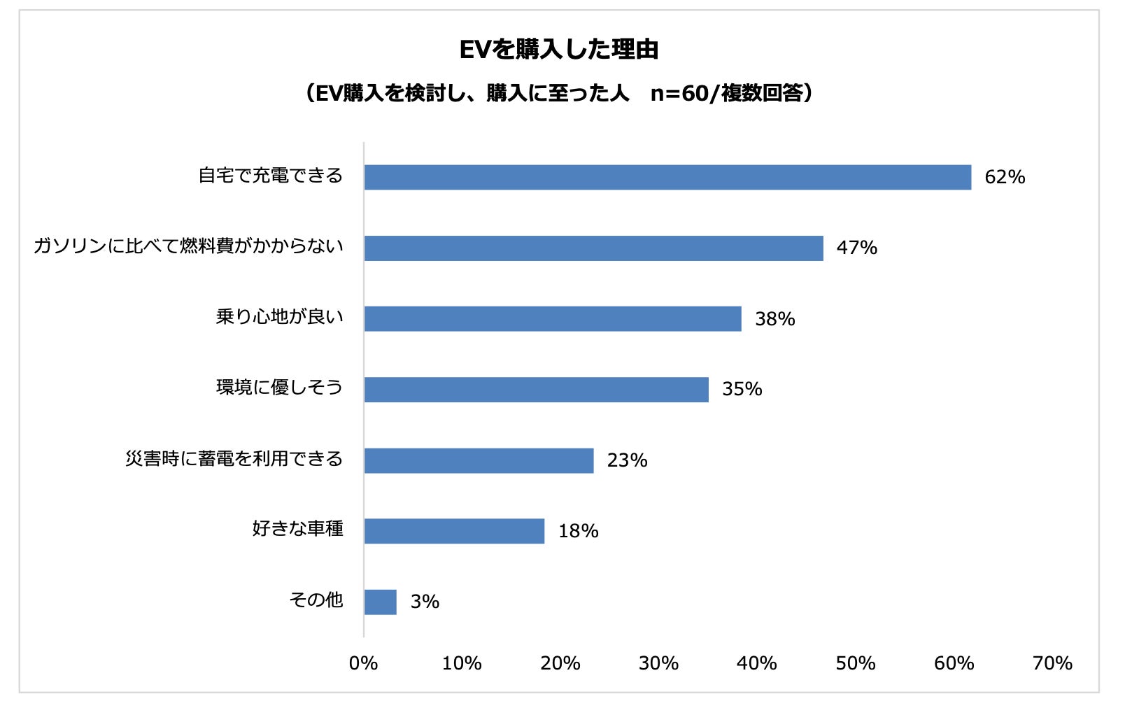EVを実際に購入した人の購入理由は、「自宅で充電できる」62%が最も多く、次いで「ガソリンに比べて燃料費がかからない」47%、「乗り心地が良い」38%と続きました。EV特有の、自宅で燃料を補給できる利便性やガソリンと比較した場合の燃料費の安さなどが評価されているようです。