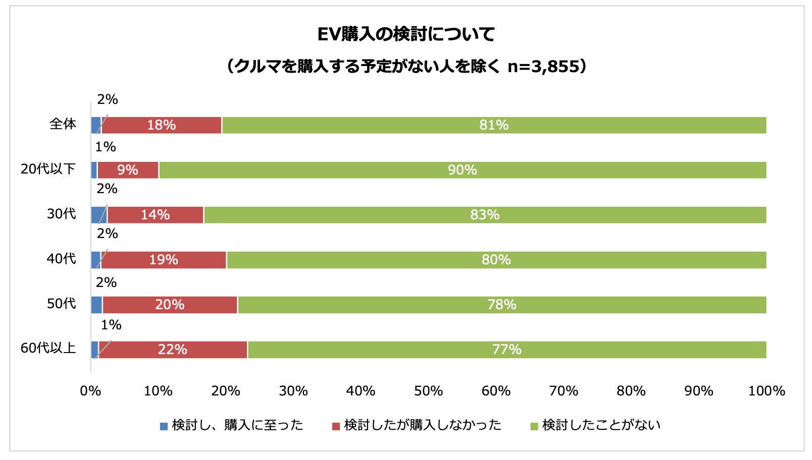 EVを保有していない人のうち8割以上は、EVの購入を「検討したことがない」ことがわかりました。年代別で見ると、年代が下がるほど「検討したことがない」の回答比率は高まり、20代以下では9割となりました。