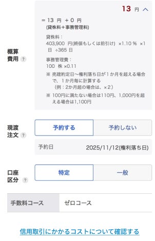取引手数料や、信用取引で必要な費用が注文画面で事前に確認できます。株主優待の特典が、コストより上回るか発注前にわかるので、より効率的に株主優待銘柄への投資を検討できるようになります。