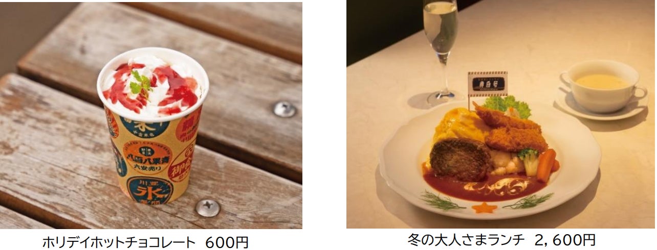 青果八百八では冬限定の「ホリデイホットチョコレート」が新登場!ホットチョコレートの上にのった生クリームとストロベリーを混ぜて飲むのがおすすめです。また、食堂車レストラン 黄昏号では、今年の春の人気メニュー「大人さまランチ」が「冬の大人さまランチ」として復活します!シャルドネスパークリング(ノンアルコール)、クラムチャウダー、クリスマスリースをイメージしたお皿にトマトソース、エビフライ・ハンバーグ・オムライスとボリューム満点! 童心に帰って楽しめる、贅沢な一品です。