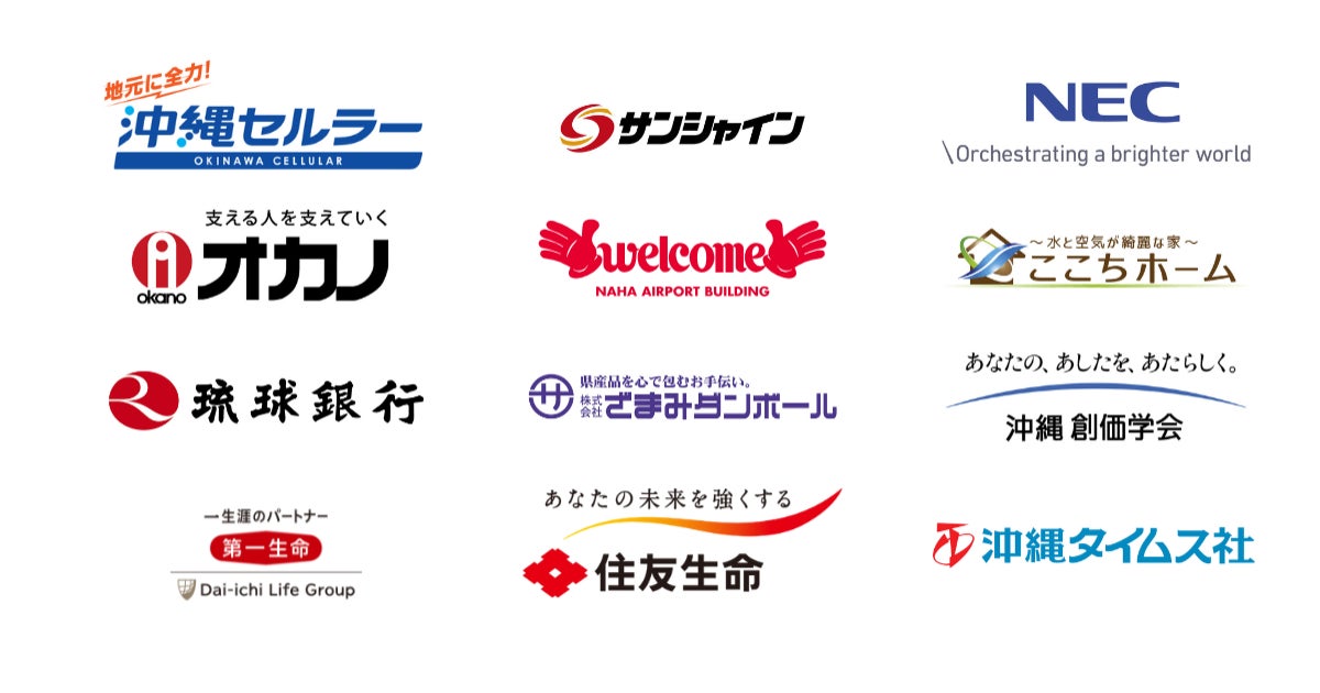 沖縄セルラー電話株式会社、株式会社オカノ、株式会社ここちホーム、株式会社ざまみダンボール、株式会社サンシャイン、株式会社琉球銀行、宗教法人沖縄創価学会、第一生命保険株式会社、那覇空港ビルディング株式会社、日本電気株式会社、住友生命保険相互会社、株式会社沖縄タイムス社