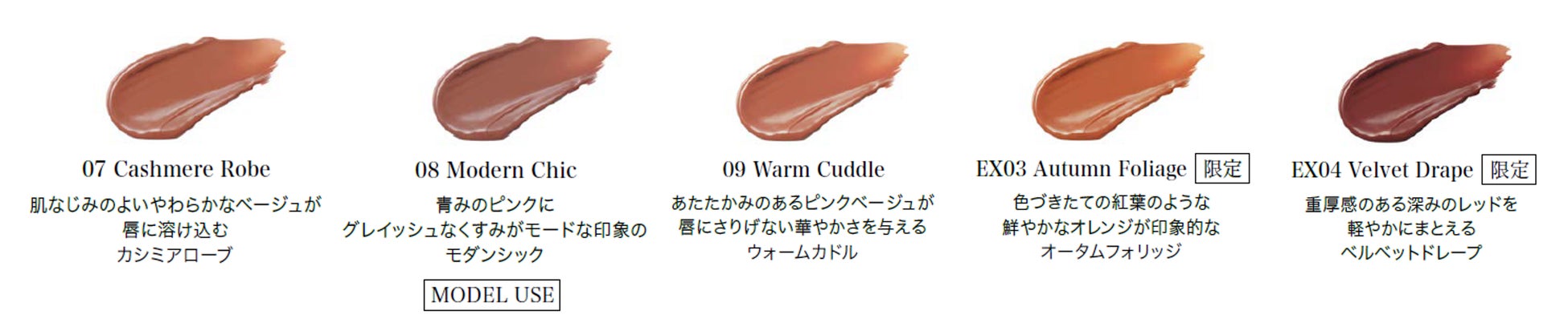 うるおいを秘めた湿度感のある自然なツヤと、鮮やかさの中にグレイッシュな要素をひそませたカラーが、色の個性を主張しながらも肌に溶け込むようになじむ設計。唇だけが浮くことなくシームレスな仕上がりに。