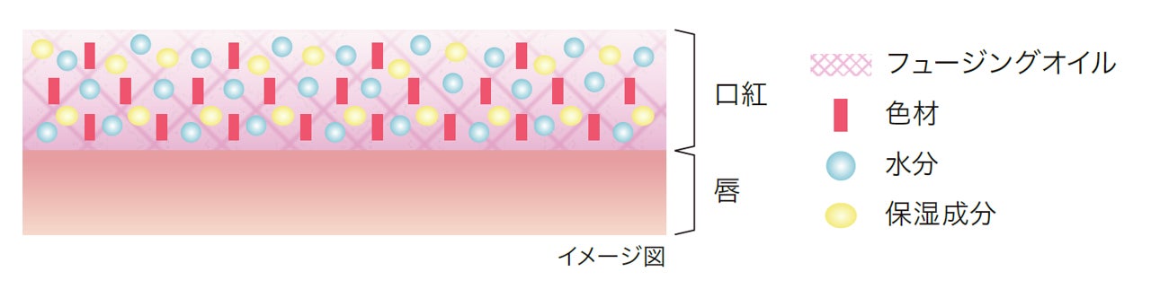 呼気や唇の水分に反応してフュージングオイルがゲル化し、口紅の色材と水分を抱えこみ密着するネット構造を形成。唇の動きにしなやかに追従するストレッチ性の高い塗膜が均一な一枚膜となり、美しい仕上がりが長時間持続。うるおい感のある唇をキープします。
