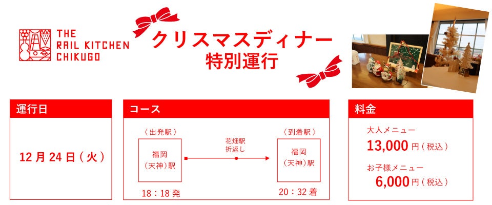 西日本鉄道(株)では地域を味わう旅列車「THE RAIL KITCHEN CHIKUGO」において、2024年12月24日(火)に、クリスマスディナー特別運行を開催します。