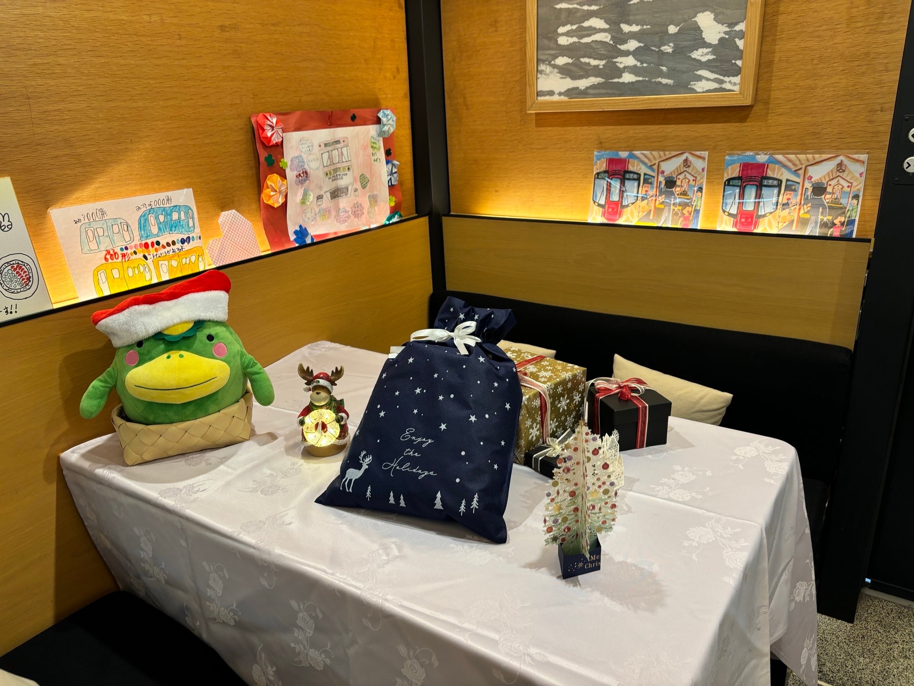 本コースでは、クリスマス装飾を施した車内空間で、通常、運行を行っていない火曜日のディナー時間帯に、車内でゆったりとお食事をお楽しみいただけます。また、ご乗車のお客さまには、クリスマスプレゼントとして、西鉄グランドホテルの焼き菓子詰め合わせもプレゼントいたします。さらに、花畑駅での約20分の停車中には、西鉄縁線駅みやげの出張販売も行い、この日限りの特別な詰め合わせの販売も実施します。