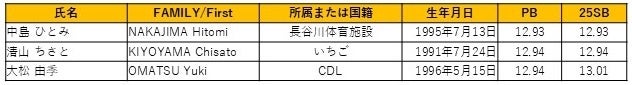 女子100mハードルには、織田記念決勝で日本歴代5位となる12秒93の自己記録で優勝した中島ひとみ(長谷川体育施設)、日本歴代6位の12秒94の自己記録をもつ清山ちさと(いちご)、大松由季(CDL)の参戦が決定。