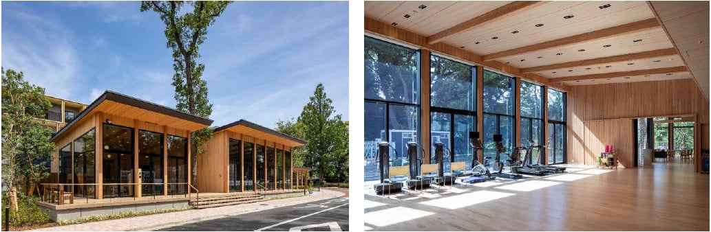 「SETAGAYA Qs-GARDEN」のまちの中心となる芝生広場に向け、地域に開いた交流拠点となる木造フィットネス・カフェ棟を設け、その外壁などには多摩産材を用い、積極的に木質化することで、東京都「木の街並み創出事業」認定を受ける等、エリア内の広大な杜と親和性のある建物としています。