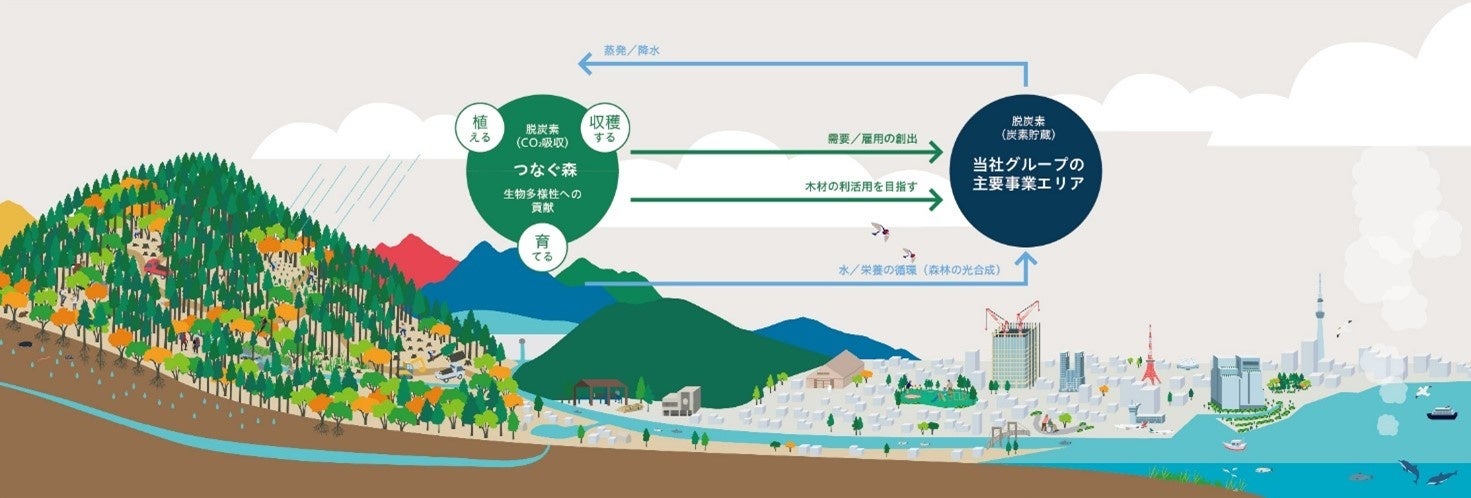 当社グループの主要な事業領域である東京都で森を保有することで、木材生産(森づくり)や木材加工において地域の森林事業体や製材加工会社等の事業者含む他企業と連携し、木材生産、一次製材、二次製材、メーカーなど、木材利用の川上から川下までの一貫したサプライチェーンを構築した上で、当社グループ事業における森林の利活用を開始しています。