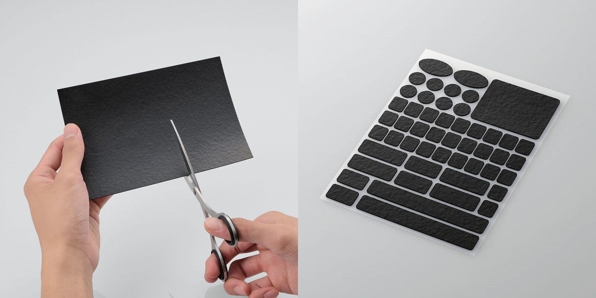 ▲ (右)プレカットタイプ:あらかじめ8種類、計50片にカット。キーボードやマウスなどに貼り付け可能
