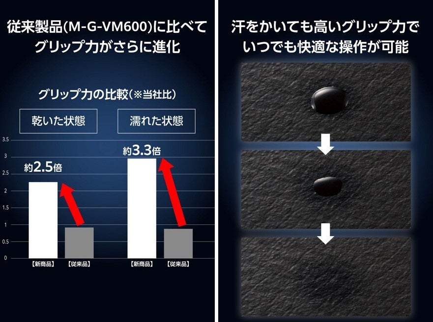 グリップ力は、従来製品(M-G-VM600)に比べて、乾いている状態で約2.5倍、濡れている状態で約3.3倍アップし、さらに進化しました(当社比)。