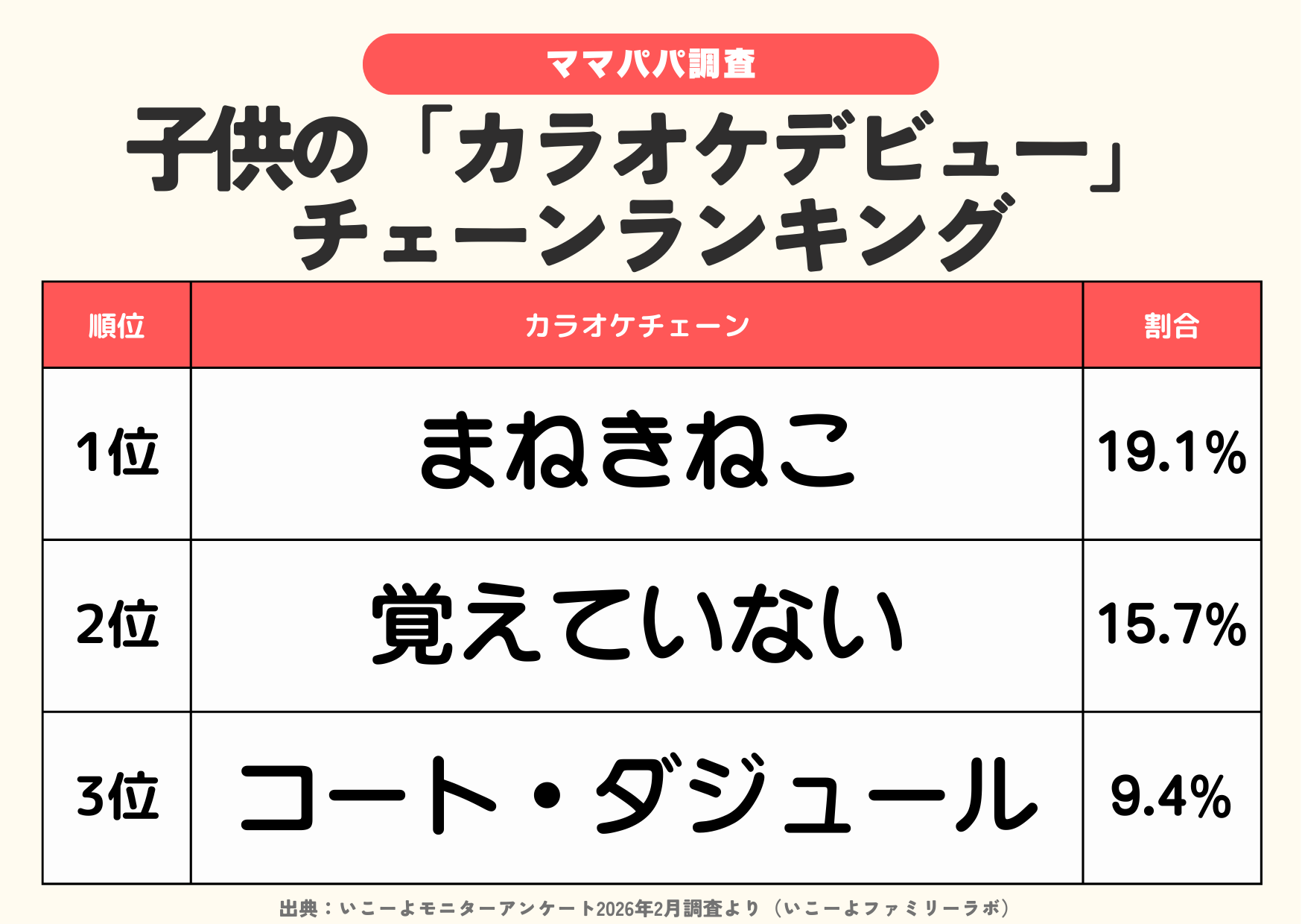 子どもとのお出かけ先として定番になりつつある「カラオケ」。アンケート調査によると、子どもの“カラオケデビュー”店舗の1位は「まねきねこ」(19.1%)という結果になりました。さらに、「まねきねこ」が選ばれた理由として最も多かったのは「キッズスペースがあるから」(41.9%)でした。