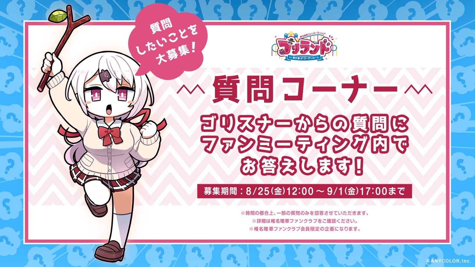 椎名唯華(VTuberグループ「にじさんじ」所属)、初のファンミーティング『椎名唯華 ファンミーティング「ゴリランド」』2023年9月30日(土)開催決定!