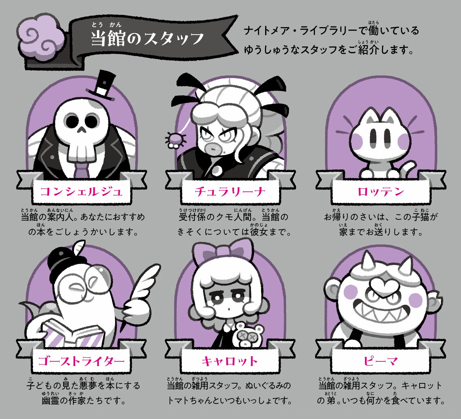 案内役のガイコツ、コンシェルジュさんは、人を怖がらせようとするわりには、おっちょこちょいでチャーミング。お手伝いのキャロットとピーマは、かわいらしい見た目に反して、ときに狂暴で不謹慎……。