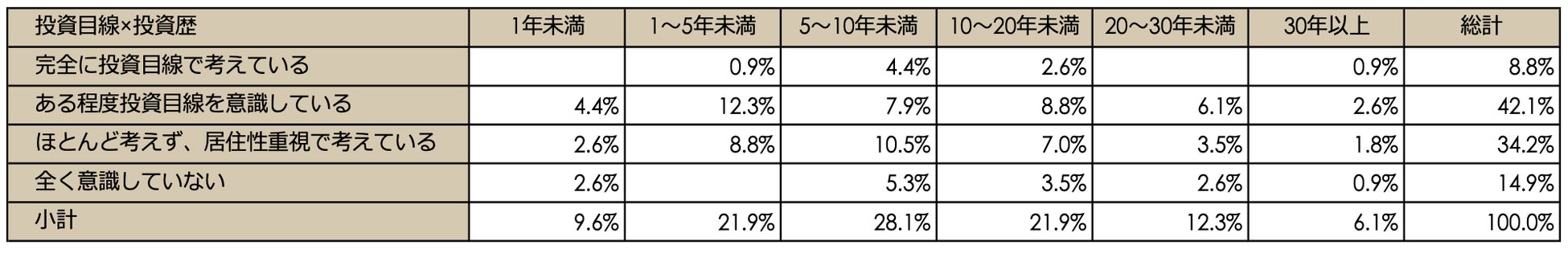 投資目線と投資歴の関係性を調べたところ、「完全に投資目線で考えている」の回答者は、投資歴が5~10年で一番多いという結果になりました。