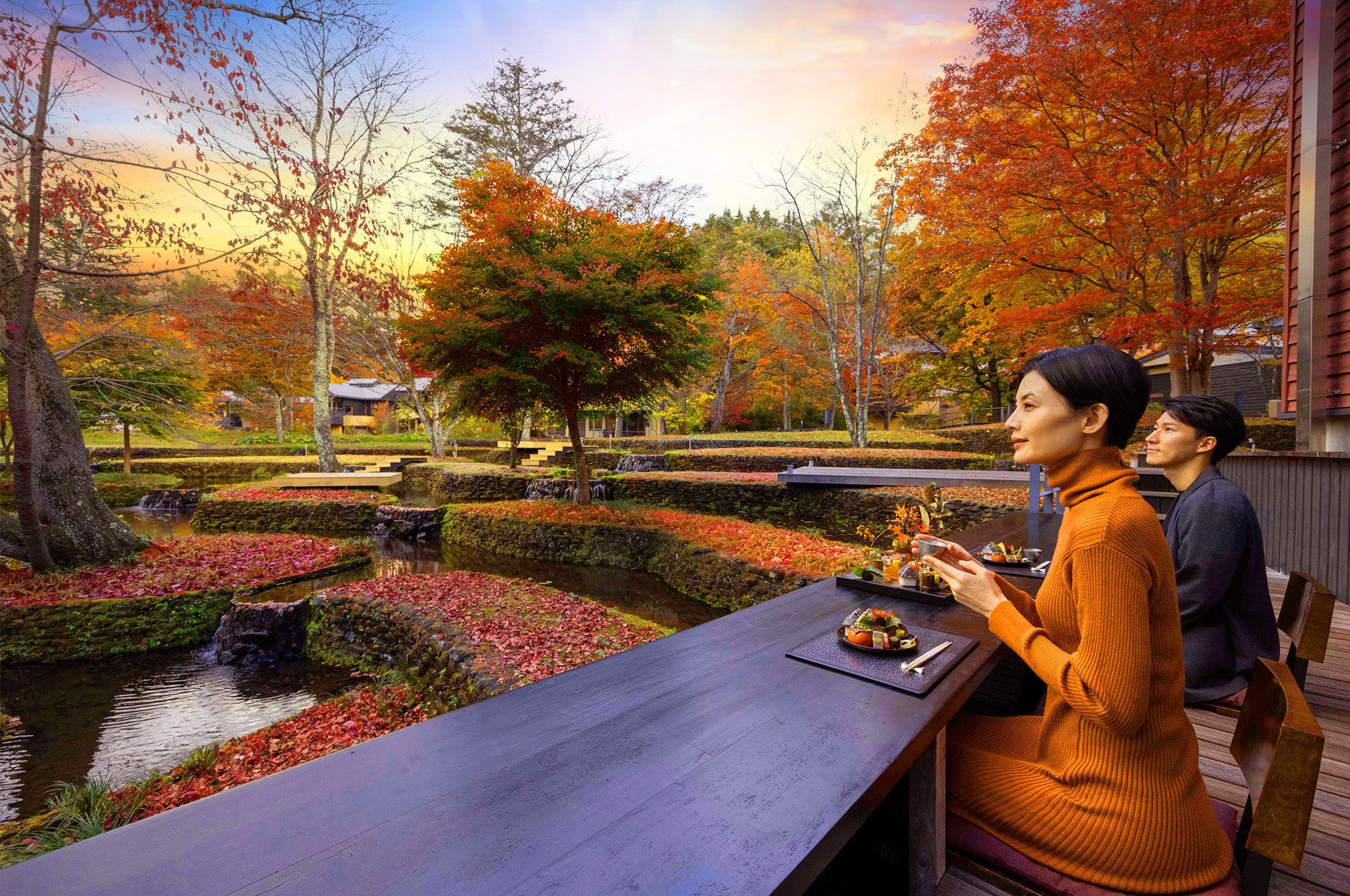 各施設が独創的なテーマで、圧倒的非日常を提供する「星のや」。その始まりの地である、長野県・軽井沢の「星のや軽井沢」では、2024年10月15日~11月10日の期間、この夏完成した「棚田ラウンジ」を貸し切り、信州の秋の実りを味わう「秋楽(しゅうらく)の晩餐」を提供します。目の前に広がる紅葉を愛でながら、秋に旬を迎える山の幸と、信州の食文化を組み合わせた特別夕食を堪能できます。さらに、食前には「棚田ラウンジ」の一角にある特別に設えた席にアペリティフを用意します。夕日に染まる紅葉を望みながら、秋の星のや軽井沢ならではの贅沢なひとときを満喫できます。