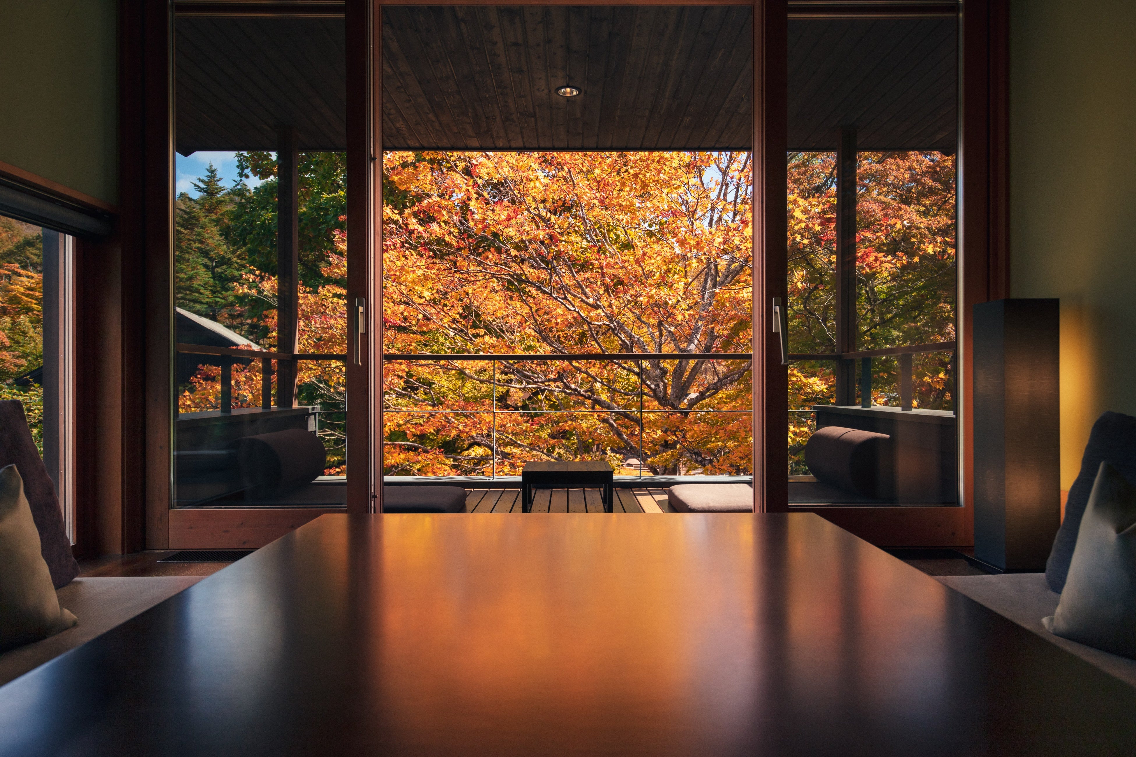 特徴3 夕日に染まる紅葉を望む、食前のひととき