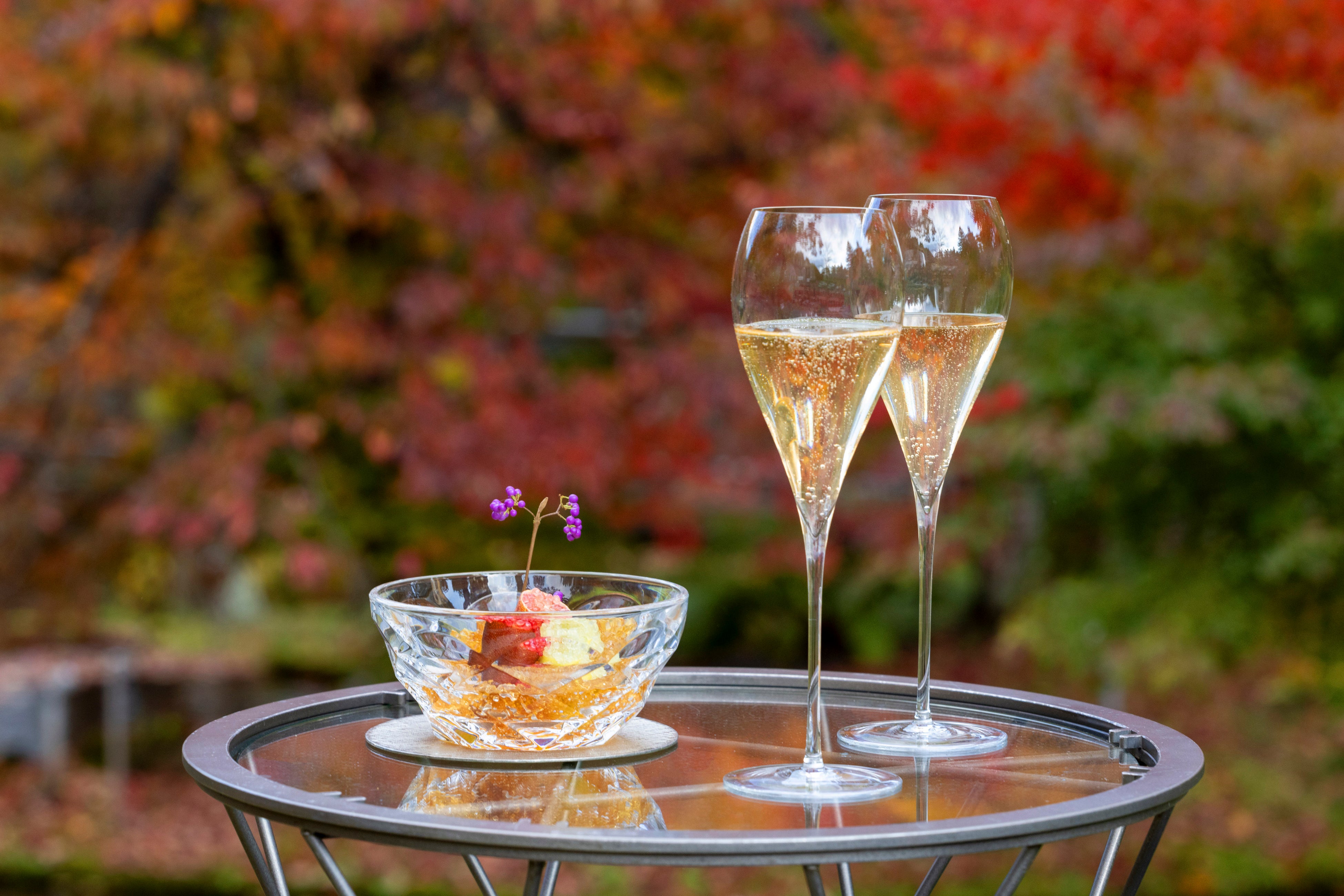 食前には、特別懐石を提供する掘りごたつ席から、飛び石を渡ってすぐのプライベートデッキエリアに、食前の特別席を用意します。ここで、提供するのはシャンパーニュを使ったゼリーに色とりどりのキャビアライムを添えた一品です。夕日に染まる棚田の情景を望みながら、秋の星のや軽井沢ならではのひとときを満喫できます。