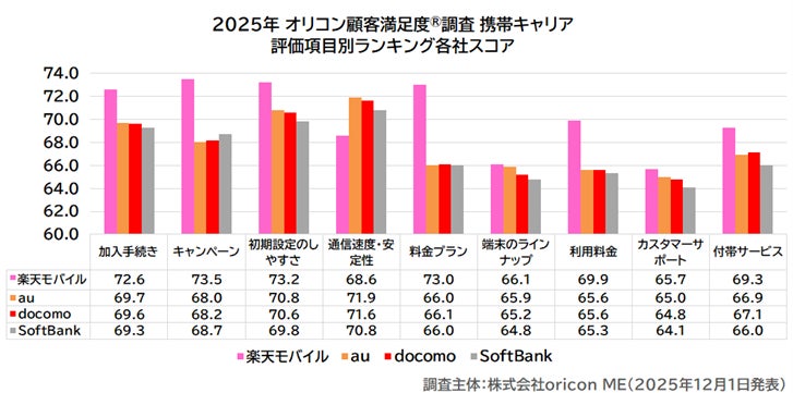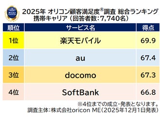 オリコン株式会社(本社:東京都港区 代表取締役社長:小池 恒、略称:オリコン)は、グループ会社である株式会社oricon MEが、実際のサービス利用者を対象に第三者の立場で実施した『携帯キャリア』の顧客満足度調査の結果を、2025年12月1日(月)14時に「オリコン顧客満足度®」公式サイト内にて発表いたしました。