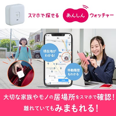 どの携帯キャリアでも利用できる、縦5センチ・横5センチの小さな「あんしんウォッチャー」。現在地や移動経路、よく行く場所のスポット登録など多様な機能を搭載しています。お子さまや、コロナ禍でなかなか会いに行くことができない離れて暮らすご家族、また、大切なバッグや荷物の安全確認など様々なシーンでご活用いただけます。