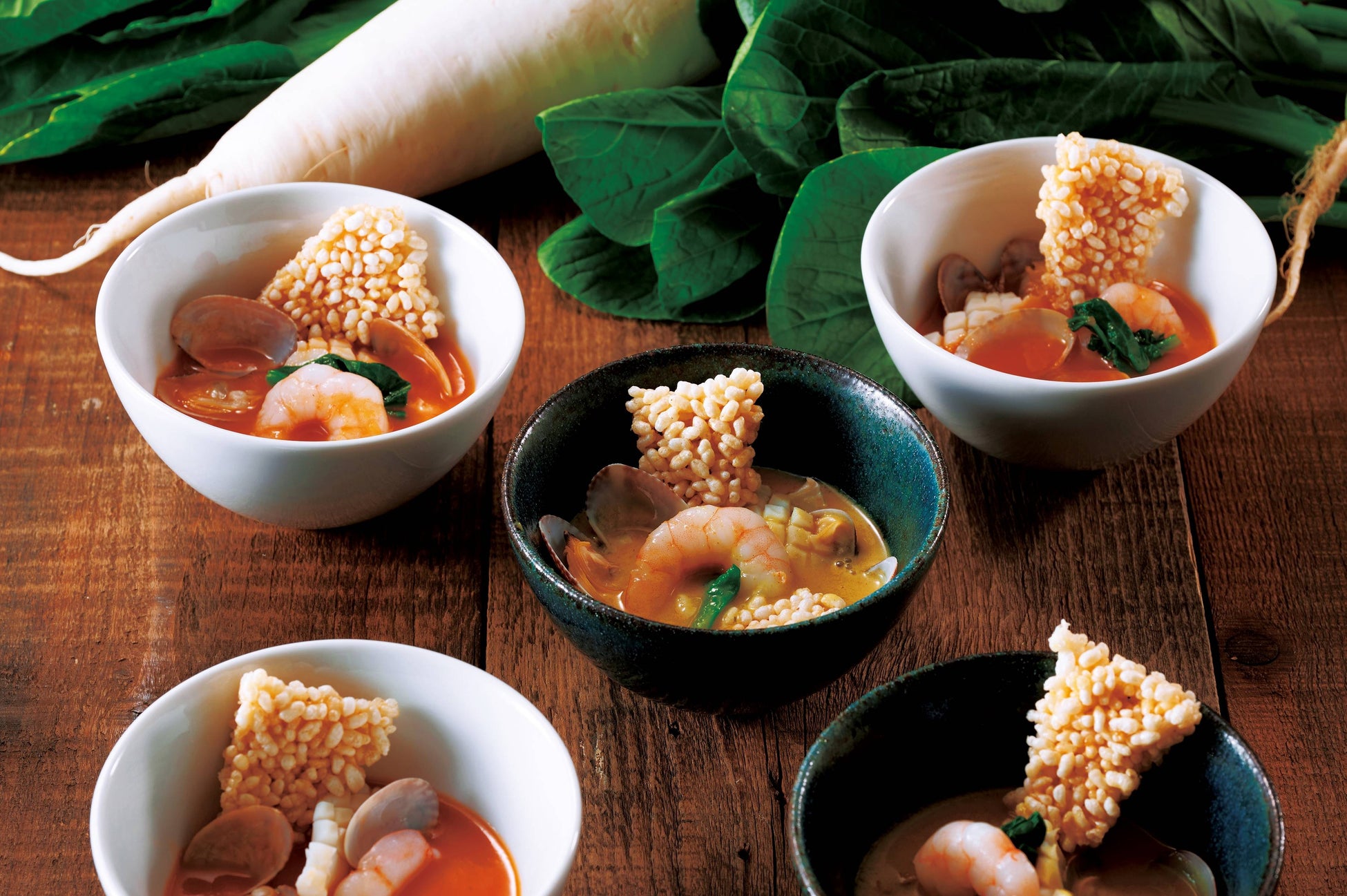 ・魚介入りスープおこげ 神奈川県産野菜とともに ビスクスープ または ラクサスープ