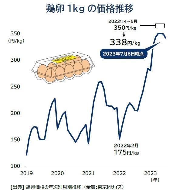 JA全農たまごによれば、7月の鶏卵1kg(東京Mサイズ)の卸売価格平均は6日時点で338円と、過去最高値だった5月から12円下落した。足元では国内鳥インフルエンザの「清浄化」も重なって鶏卵供給量が回復しているほか、加工用の輸入鶏卵も大幅に増加している。ただ、輸入トウモロコシなど飼料価格や電気代の上昇など養鶏コストは増加が続いており、鶏卵価格の大幅な下落は見込みづらい。外食産業の卵メニュー休止の動きは緩やかに解消へ向かうとみられるものの、卵価の高止まりを理由とした「値上げ」が今後広がる可能性がある。