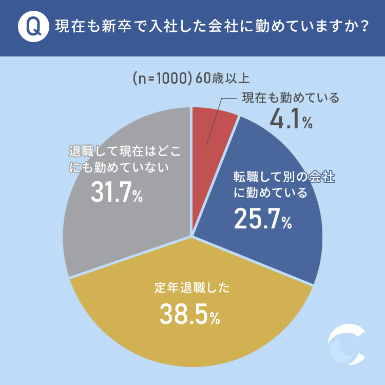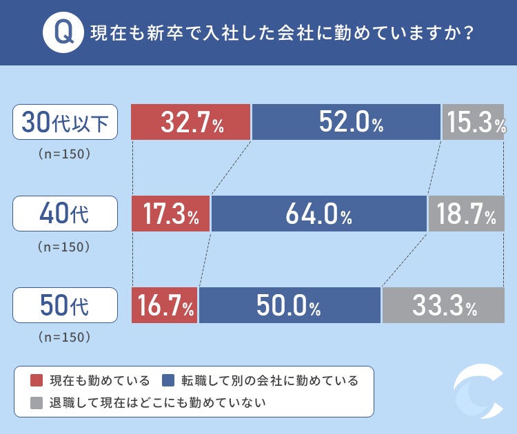 まず、現在も新卒で入社した会社に勤めているかについて聞きました。