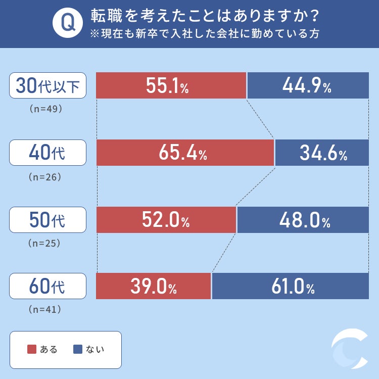 転職を考えたことはあるかという質問では、各世代で半数以上の方が「転職を考えたことがある」と回答しました。