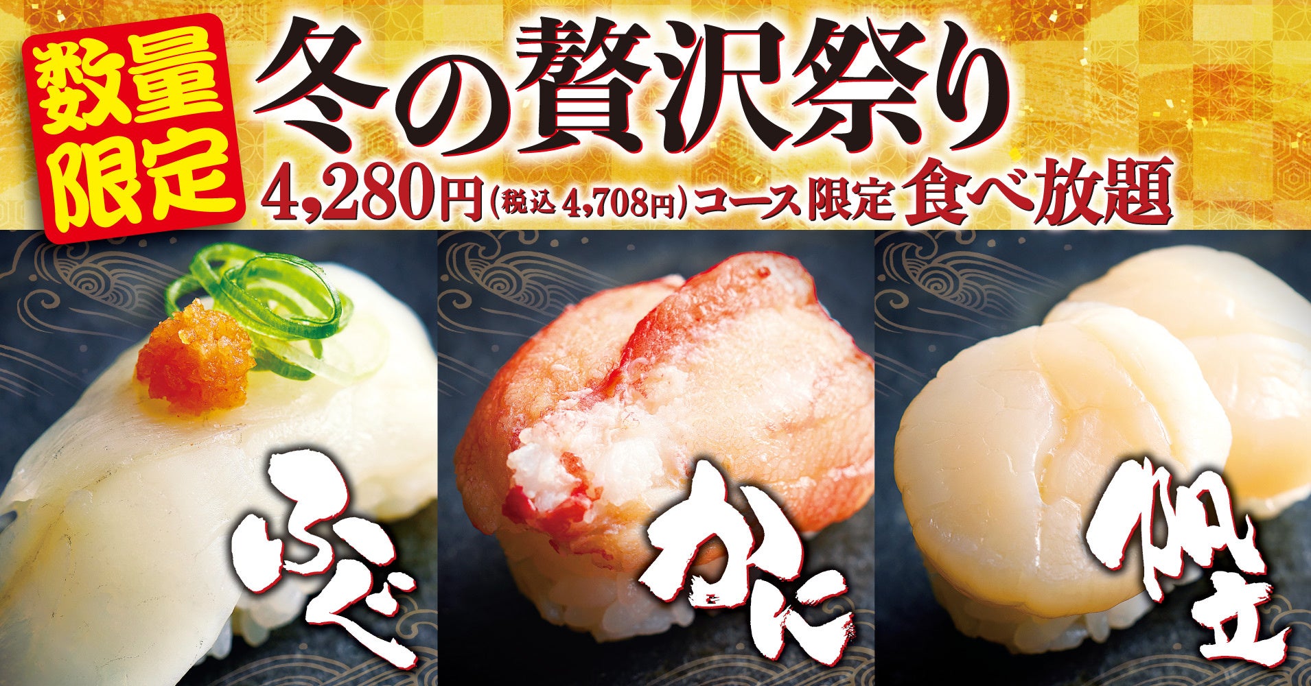 2023年11月28日(火)から2024年1月中旬の期間限定で、「贅沢コース4,280円(税込4,708円)」をご注文のお客様限定で、「ふぐ・かに・帆立 冬の贅沢祭り」を開催いたします。