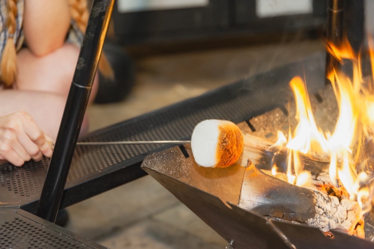 焚火でマシュマロを炙って、チョコとビスケットで挟むスモア体験。心も体もほっこり温まります。