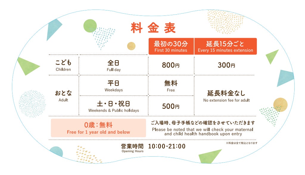 ご利用料金:0歳のお子さまは無料です※年齢がわかる証明書をお持ちください