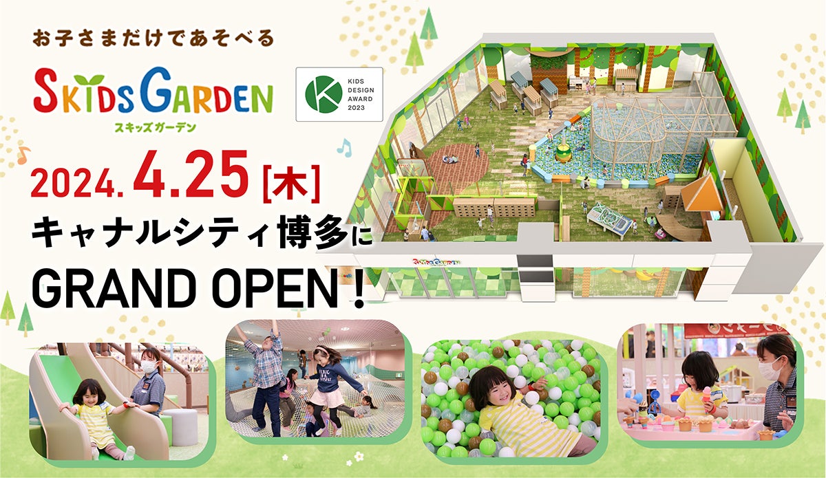株式会社イオンファンタジー(千葉県千葉市、代表取締役社長:藤原徳也、以下、イオンファンタジー)は、4月25日(木)、「キャナルシティ博多」(福岡県福岡市)にプレイグラウンド「スキッズガーデン キャナルシティ博多店」をオープンいたします。「スキッズガーデン キャナルシティ博多店」は、0歳から小学2年生のお子さまを対象とするプレイグラウンドで、3歳以上ならお子さまのみでも入場できるファミリーのための新スポットです。保育士資格等をもつ“遊びのプロ”である「プレイリーダー」がお子さまの遊びをサポートするので、お子さまが夢中になって遊ぶ間、保護者さまはゆっくりとお買い物を楽しむなど、親子それぞれで有意義な時間を過ごす体験を提供します。●スキッズガーデン公式WEBサイト:https://www.fantasy.co.jp/skidsgarden/