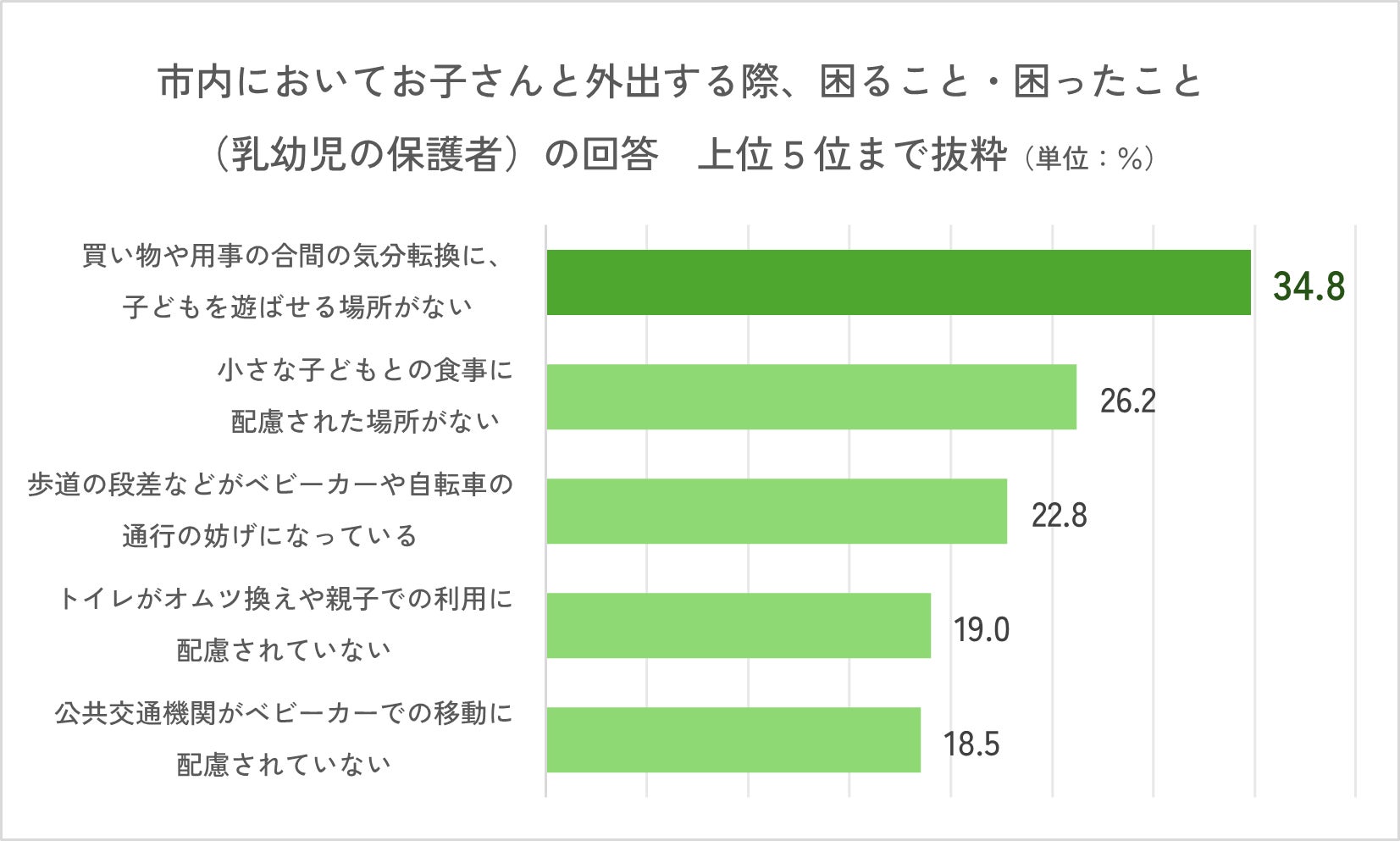 福岡市では2020年時点で15歳未満の子どもが約20万人、夫婦と子ども・ひとり親と子どもの世帯を合わせた子育て世帯が約28%を占めています。平成30年度に福岡市により行われた「福岡市子ども・子育て支援に関するニーズ調査」では、「市内においてお子さんと外出する際、困ること・困ったこと(乳幼児の保護者)」という項目に対して挙げられた回答の第1位が「買い物や用事の合間の気分転換に、子どもを遊ばせる場所がない」(34.8%)でした。市内において、特に5歳までの乳幼児を抱える保護者のこのような遊び場のニーズが高いことが伺えます。