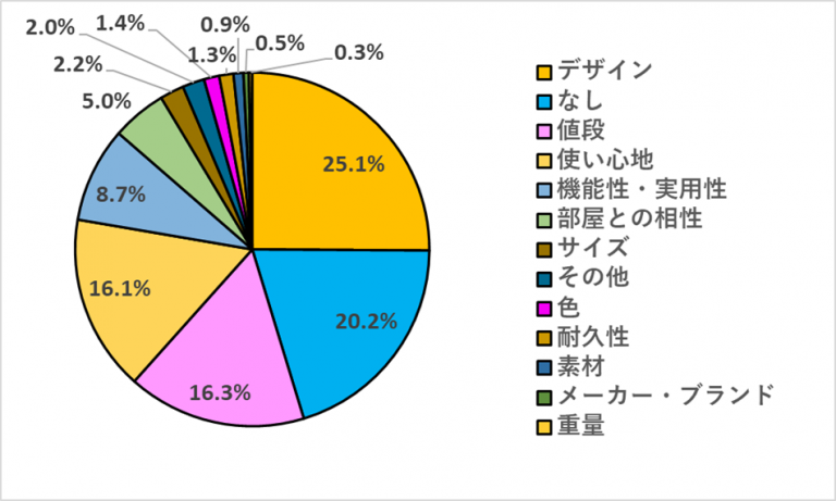 インテリアグッズを買うときの基準については、「デザイン」が25.1%、「値段」が16.3%、「使い心地」16.1%という順になりました。デザインが好みかどうかを購入の決め手にしている人が多いようですね。