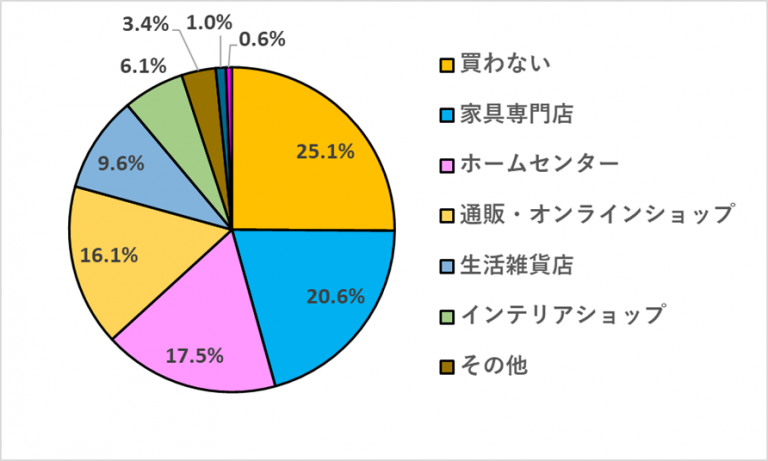 インテリアグッズを買う場所については、「買わない」という25.1%の人を除くと、「家具専門店」が最も多く20.6%、次いで「ホームセンター」が17.5%という結果になりました。