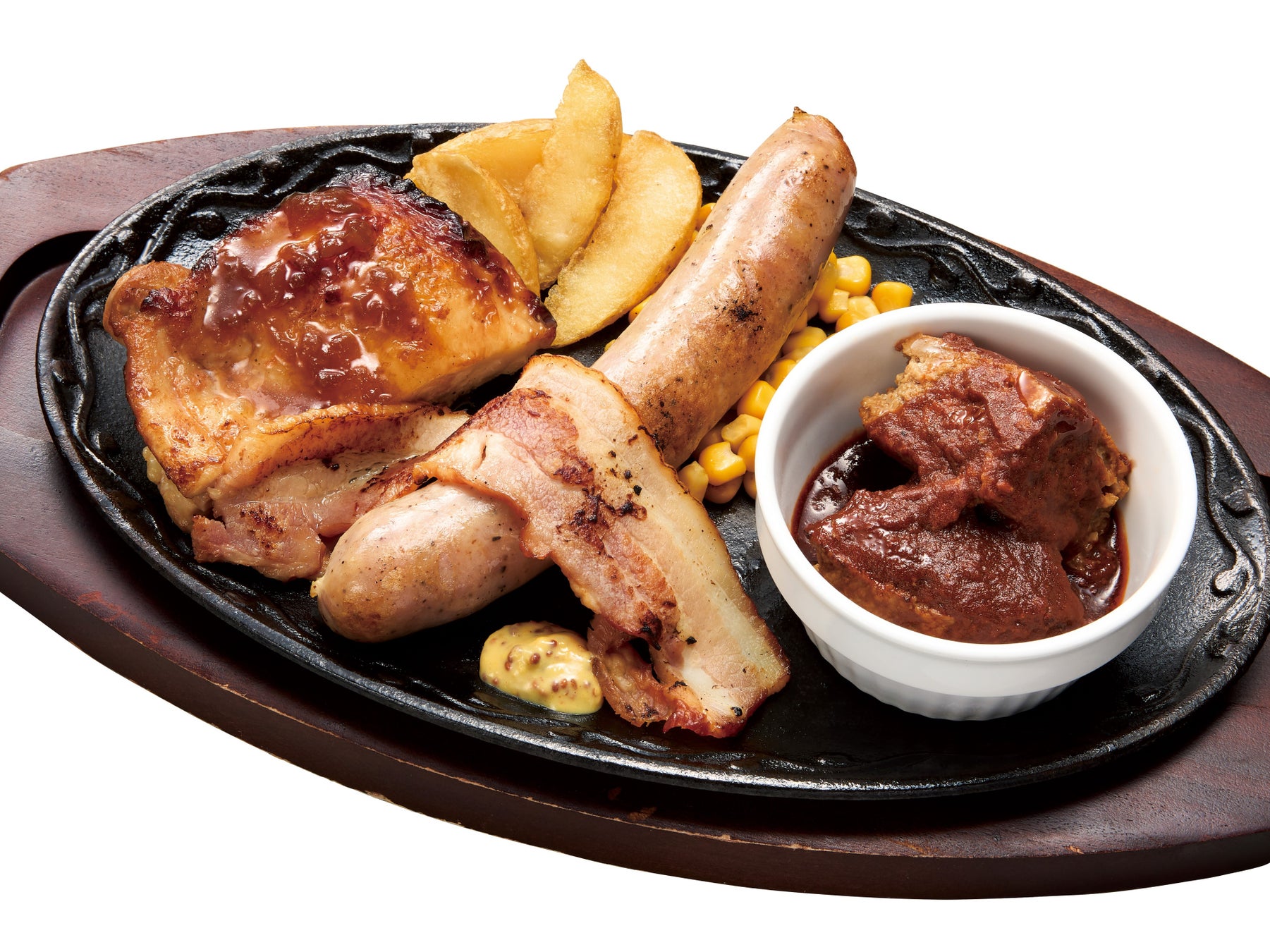 昭和30年創業の小玉精肉店が原点の 「肉」にこだわり抜いたバルより、豪華に4種類の肉料理が味わえる、満足感のあるプレート!アンガス牛を使用したハンバーグ、照り焼きチキン、黒コショウソーセージと、カリッと焼き上げた自家製ベーコンで、たっぷり肉の味わいを楽しめます。小サラダ、ライスまたはパン、コーヒーまたは紅茶つき。 ※ランチ限定 ※数量限定:1日15食限定