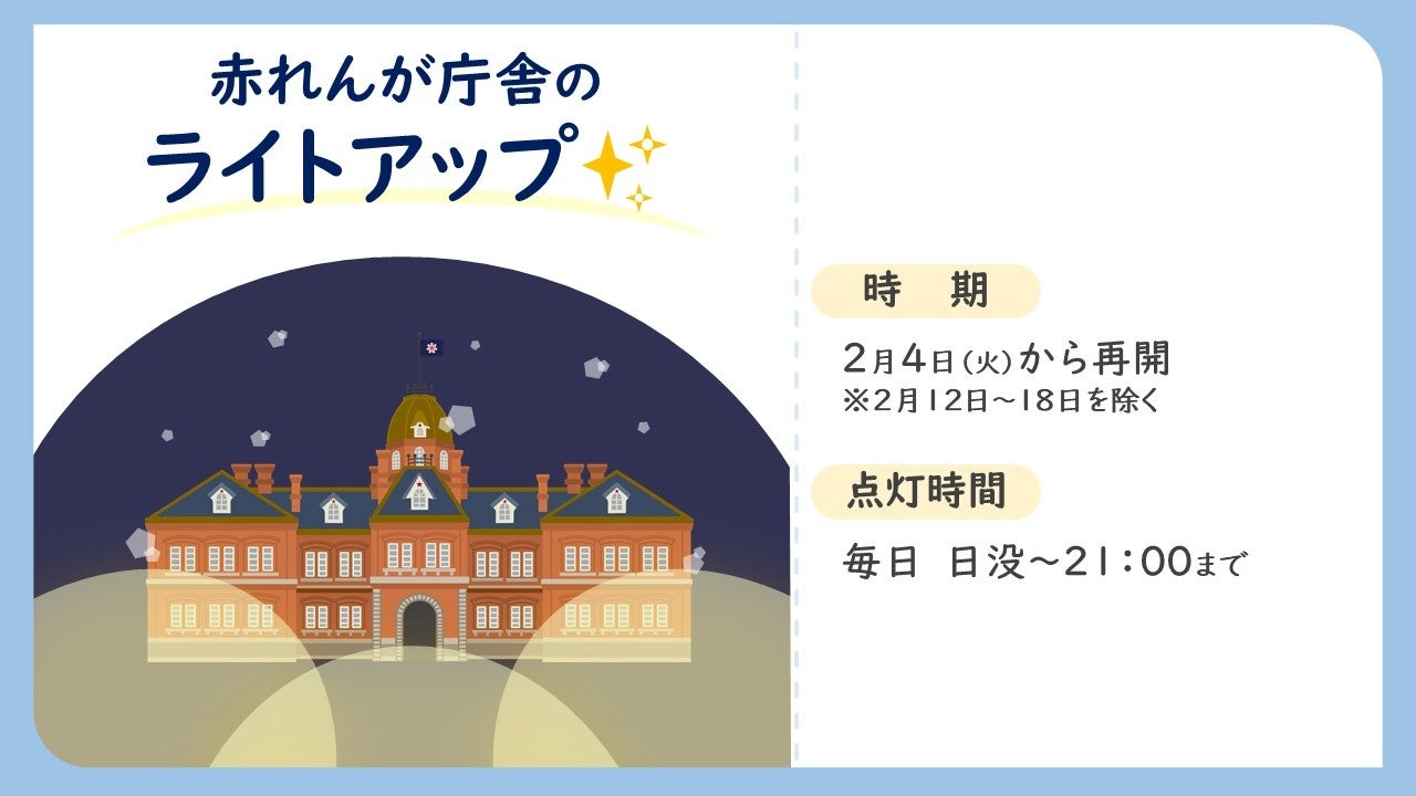 また、雪まつり開催にあわせ、赤れんが庁舎のライトアップも実施いたしますので、雪まつりにお越しの際は、赤れんが庁舎にもぜひ、お立ち寄りください。