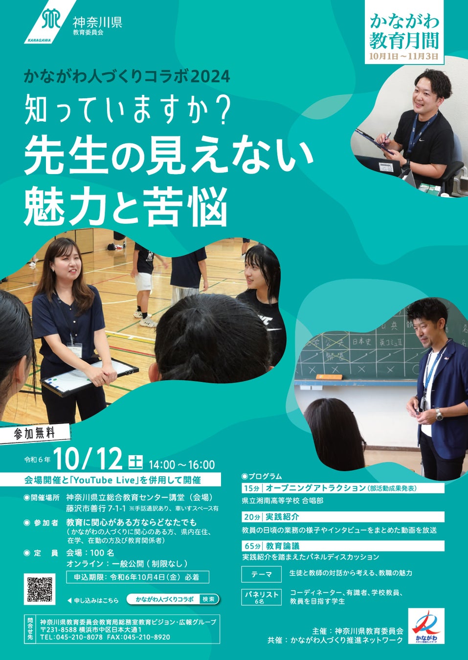 神奈川県教育委員会及びかながわ人づくり推進ネットワークでは、本県の教育の総合的な指針である「かながわ教育ビジョン」に基づき、これからの教育や人づくりについて考える場として毎年「かながわ人づくりコラボ」を開催しています。「かながわ人づくりコラボ2024」では、教員の実際の業務を取り上げた実践紹介と教育論議を通して、かながわのこれからの教育について県民の皆様と一緒に考えていきます。ぜひ、ご参加ください。